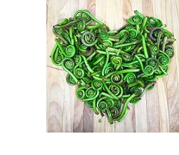 Unfortunately without musical properties,ย Fiddleheadsย are the top portion of young, edible ferns, usually of the Ostrich variety. Bright green and tightly coiled, they are about the size of a quarter and look like the end of a string instrument. They can be found in areas with wet soil, like the edges of forests, rivers and marshes. If not foraged in time, fiddleheads uncurl into new leaves of the fern, and no longer have the same pleasing taste. Due to their short availability, fiddleheads are regarded as a rare delicacy, but should not eaten raw, as they contain harmful enzymes and acids. Before cooking, make sure to remove any brown, protective barrier by rubbing gently or washing fiddleheads in cold water. Fiddleheads have a grassy and slightly nutty flavor, similar to asparagus, broccoli or spinach. To taste their true flavor, they can be cooked simply by sautรฉing with seasoning and butter or oil. However, they are also delicious steamed, boiled, fried or baked. Try them in soups, stir fry, casseroles and on pizza. They pair well with garlic, mushrooms, tomatoes and bacon.