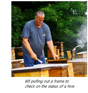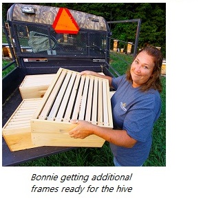 Our tour guides first explained to us that each new season starts in spring, when hives that were lost during the winter are replaced. Each hive โneeds to be cleaned out and made ready to receive the new bee package, which arrives late March to early April,โ Bonnie described. A โfeeder bucketโ of sugar water is placed on top of each hive to feed the new bees and โgive them a boost since a lot of trees are not in bloom yet and they are very hungry.โ For most of the summer the bees are left alone to produce honey, except for โperiodic checks to ensure there is a good laying Queen to keep building up the work force and that there is no disease in the hive.โย